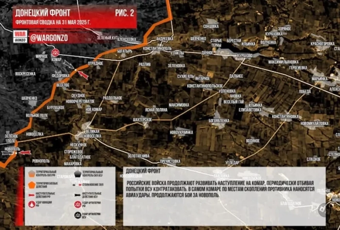 Наступление на Комар сейчас идет по двум направлениям: от Отрадного вдоль трассы Н-15 и от Веселого через Федоровку, которую ещё надо освободить, прежде чем прорваться на окраины Комара с юга. Идёт подготовка к битве за Комар: наши подтягивают войска, очень активно работает авиация ВКС РФ, нанося удары ФАБ по укрепам ВСУ. Не спят и артиллеристы.