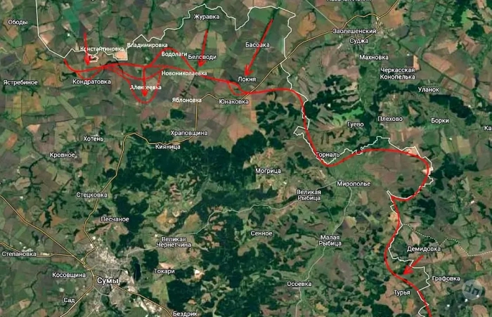 Группировка войск «Север» ВС РФ наступает в Сумской области фронтом шириной 13 километров и в настоящий момент стоит по линии Владимировка - Водолаги - Беловоды - Локня. Дальнейшее продвижение на юг позволит выйти на рубеж Алексеевка - Новониколаевка - Варачино - Яблоновка - Юнаковка и создать плацдарм для выхода на Сумы с севера и северо-востока.