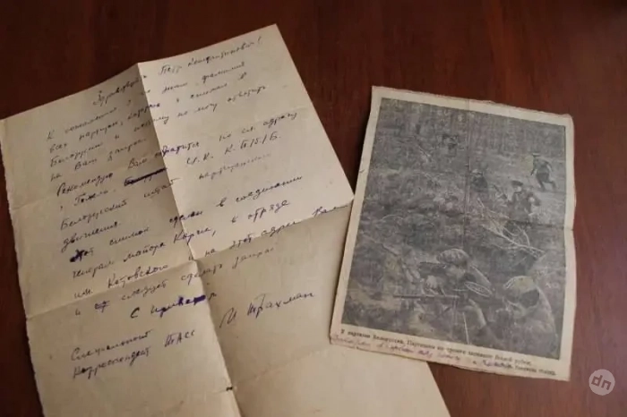 Письмо от военкора из газеты и фотография, на которой позади пулеметчика с танковым ДТ виден похожий на Костю парень в кепке и с пистолетом