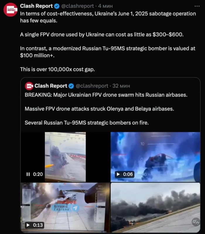 Трамп вообще не в очень хорошем положении сейчас, особенно после воскресных атак. Но это его проблемы. Еще проблема и США, и Европы в том, что Киев совершил атаку на компоненту ядерной триады сдерживания России. Да, тут красных линий перейдено уже столько, что одной больше, одной меньше... Но тем не менее - это повод задуматься в Европе всем. Ибо никто, подчеркну, никто не даст завтра гарантию, что в случае прекращения финансирования клики Зеленского, дроны не полетят в Елисейский или Букингемский дворцы.