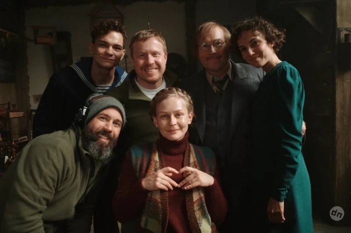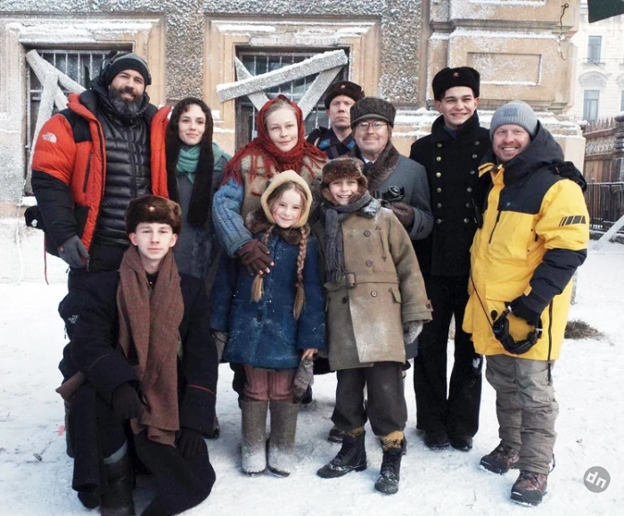 Пересильд, рядом с ней (слева) Михаил Милашин, Слава Копейкин, Антон Богданов, Виктор Сухоруков, Стася Милославская на съемках фильма «Красавица». Февраль 2025 года