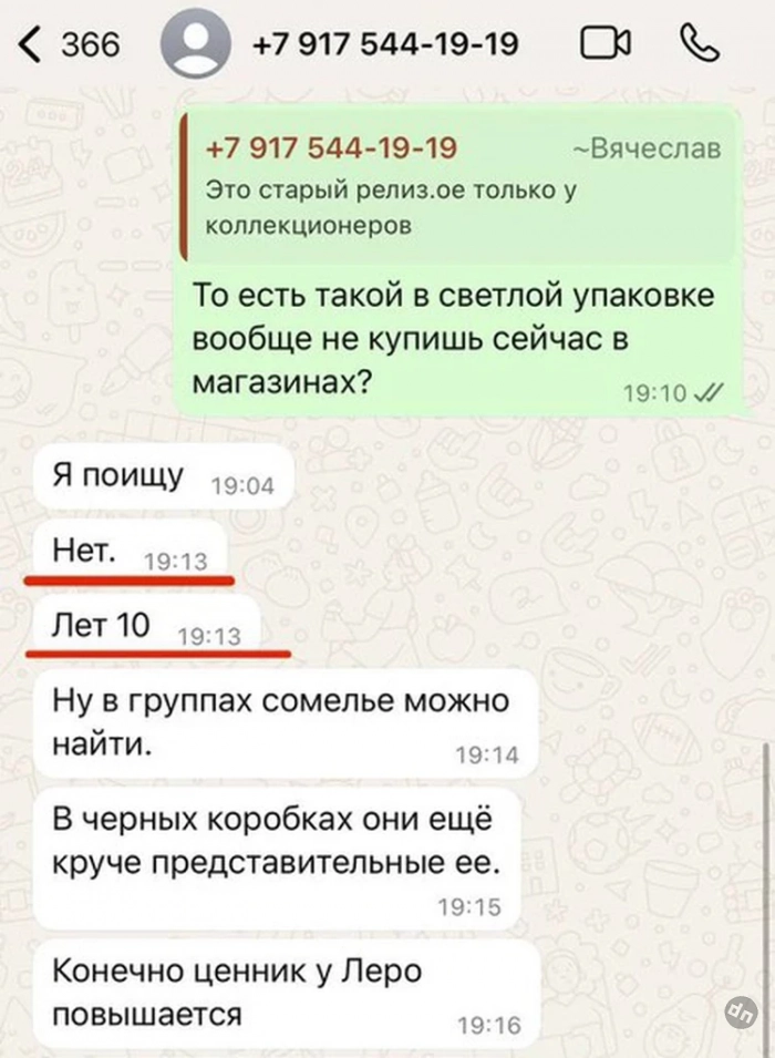 В подарок была предоставлена гораздо более редкая бутылка, а следовательно, и более дорогая, того же напитка, который нашёл Толмацкий у этого продавца. Реально же продавец предлагает её за 159 490 руб. Вы видите это в переписке. И, конечно, цены, указанные в интернете, могут отличаться от реальных. Кроме того, этих товаров может не быть в наличии. Надо проверять, а не сразу бросаться обвинениями! Обратите внимание, что этот винтажный напиток уже как 10 лет не продается в магазинах. Именно это объясняет отсутствие чека и оплату физическому лицу. Также обратите внимание, что номер телефона магазина в переписке совпадает с номером, который указан на скриншоте Толмацкого. И вот с этой фейковой информации, преподнесенной Толмацким, начался скандал», — пояснил KP.RU Никита Турчин.
