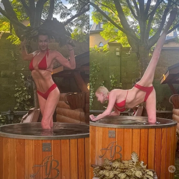 Давно не было фирменных шпагатов от Анастасии, и вот пожалуйста — получите! Знаменитая балерина нарядилась в красное бикини и продемонстрировала растяжку в ледяной купели. А вместо соломенной шляпки звезда использовала банный веник. Кстати, купель стоит прямо у Волочковой прямо во дворе. Что ж, красиво жить не запретишь!
