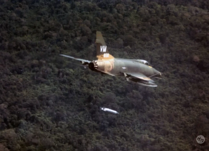 F-100 массово применялся по целям в Лаосе. На фото — одна из атак этого самолёта во Вьетнаме.