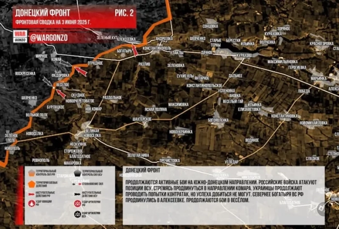 Вчера сообщалось, что наши части продолжили зачищать посадки западнее Отрадного и постепенно идут к восточным окраинам н.п. Комар. С учетом того, что село находится в долине и перепад высот там с восточных окраин очень большой (более 20 метров), с выходом наших штурмовиков на эти самые восточные окраины гарнизон противника в Комаре будет приговорен. Одновременно севернее Богатыря ВС РФ продвинулись в Алексеевке. Продолжаются бои в Весёлом.