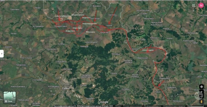 По его словам, ВС России продвигаются к поселку Хотень, расположенному в 12 километрах от города Сумы. Подоляка убежден, что российские войска попытаются превратить эту точку в место накопления резервов, что позволит создать плацдарм для подготовки штурма Сум и взятия города.