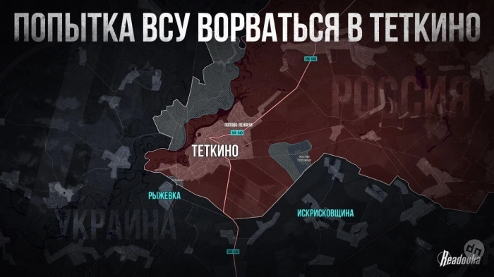 На Сумском направлении противник не бросает попыток закрепиться в Тёткино Курской области. ВСУ ведут атаку сразу по нескольким направлениям, пытаясь максимально сковать в маневре наши силы прикрытия границы. В частности, украинцы атакуют со стороны сёл Рыжевка и Искрисковщина. Задача неприятеля очевидна - отрезать наш гарнизон в Тёткино от сообщения с тылом по трассе 38К-040. При этом украинские штурмовые группы сумели закрепиться у приграничных водоочистных сооружений в 3 км к юго-востоку от Теткино. Противник пытается развить успех и заскочить в прилегающее к поселку село Попово-Лежачи - так он, судя по всему, хочет перерезать шоссе 38К-040: это его главная задача, сообщает Telegram-канал Readovka. Кроме того, ВСУ ведут вспомогательные атаки в направлении урочища Монахов Лес в 7 км к востоку от Тёткино и в направлении села Обуховка. Этим противник пытается не дать нашим подразделениям прикрытия границы сконцентрироваться для контрмер в районе Тёткино.