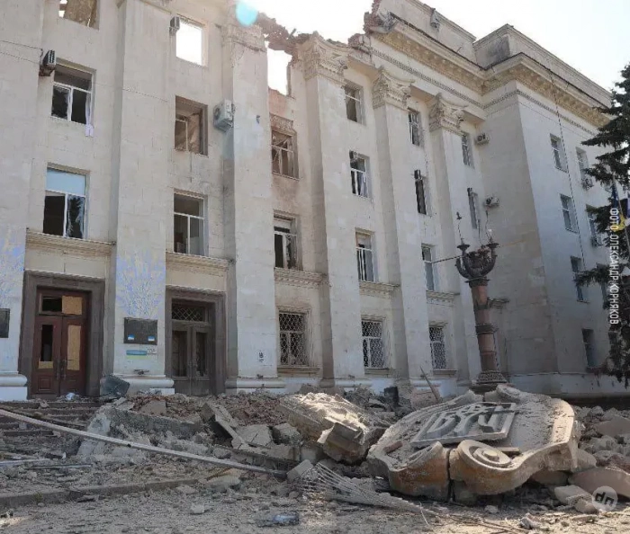 Сначала обрушился тризуб, а за ним и большая часть здания: появились новые кадры с результатом удара по оккупационной Херсонской администрации Украины