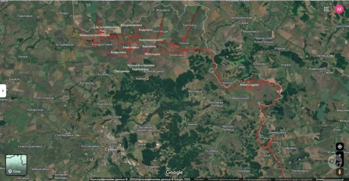 Российские войска имеют тактические успехи южнее Андреевки и Алексеевки, на северных окраинах Яблоновки и Юнаковки, продолжаются встречные бои. На фоне наступления ВС РФ киевский режим вынужден эвакуировать население более ста населенных пунктов в Сумском регионе, информирует "Военное обозрение".