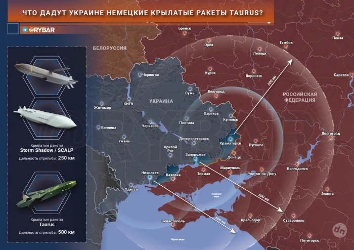 Зоны досягаемости различного украинского высокоточного оружия большой дальности. Изображение ТГ-канал «Рыбарь»
