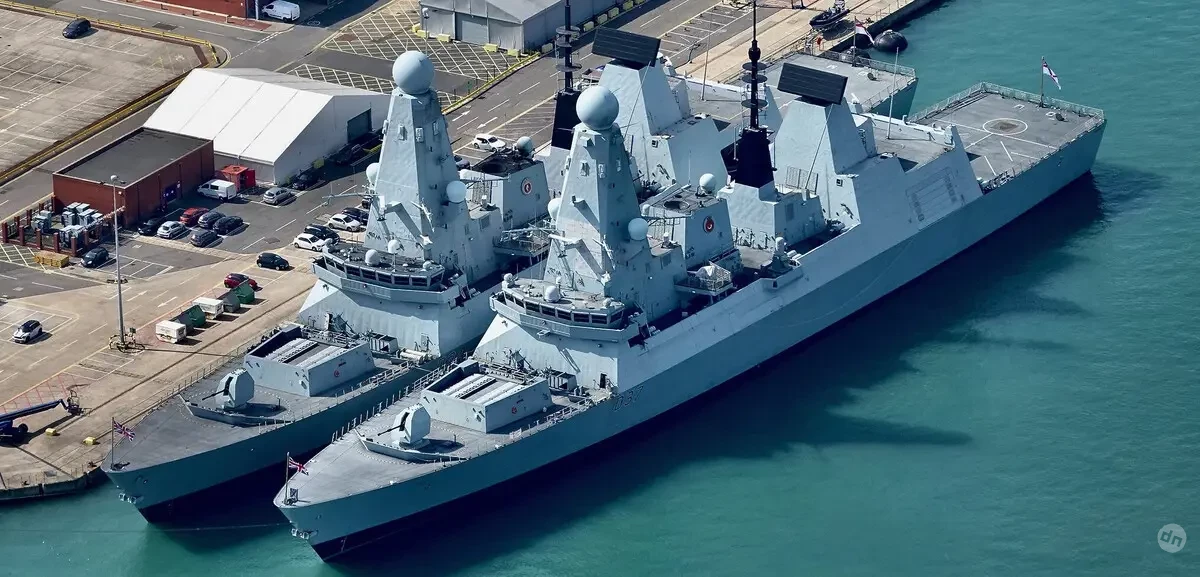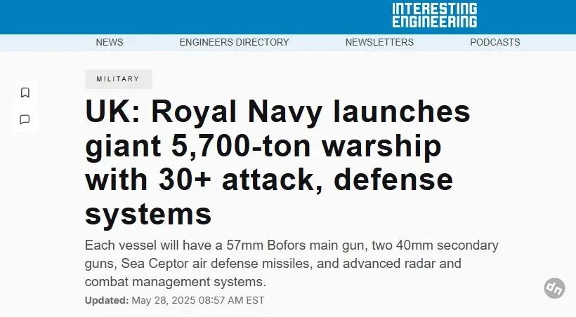 «Великобритания: Королевский военно-морской флот спустил на воду гигантский военный корабль водоизмещением 5700 тонн с более чем 30 системами нападения и защиты».