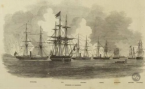 Поначалу противник вёл ответный огонь с большой точностью и ловкостью; но вскоре, после того как «Фокс» подошёл и дал бортовой залп, а «Снейк» перешёл к уничтожению, примерно к 11 часам стрельба справа от нас почти прекратилась. Однако военные пароходы продолжили свой путь, с грохотом обрушиваясь на укрепления по обеим берегам реки, полностью разрушив частоколы на берегу в Рангуне и успешно обстреляв Даллу из пушек. Большой частокол, расположенный к юго-западу от Шведагона, был подожжен метко пущенным снарядом, который вызвал взрыв порохового погреба; и вскоре всё заволокло чёрным дымом и ярким пламенем — всё выше и выше, к светлым небесам, пока не запылал весь город, сцена приобрела необычайную красоту и ужасное величие... После того, как частокол в Далле был уничтожен, группа моряков и морских пехотинцев на четырёх шлюпках высадилась на берег и взяла это место штурмом.