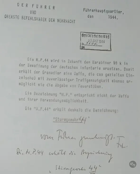 6 апреля 1944 года верховный главнокомандующий ВС Рейха издал приказ, посвященный системе стрелкового оружия вермахта, в котором MP 43 переименовали в MP 44, при том, что никаких нововведений не было. Осложнение военной ситуации привело к тому, что в октябре 1944 года Гитлеру пришлось издать еще один приказ, согласно которому MP 44 теперь назывался наконец-таки StG 44 (Sturmgewehr). Новое (правильное) название стало более точно отражать роль и основное назначение этого оружия в бою, хотя изначально оно было введено для поднятия духа войск. В конструкцию автомата не было внесено никаких изменений, за исключением штампа.