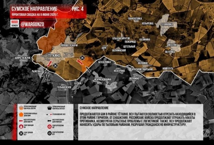 На Сумском направлении продолжаются бои в районе Тёткино. ВСУ пытаются полностью отрезать находящийся в этом районе гарнизон, от снабжения. Российские войска продолжают отражать накаты противника, несмотря на серьезные проблемы с логистикой. Также, ВСУ продолжают наносить удары по тыловым районам, разрушая гражданскую инфраструктуру.