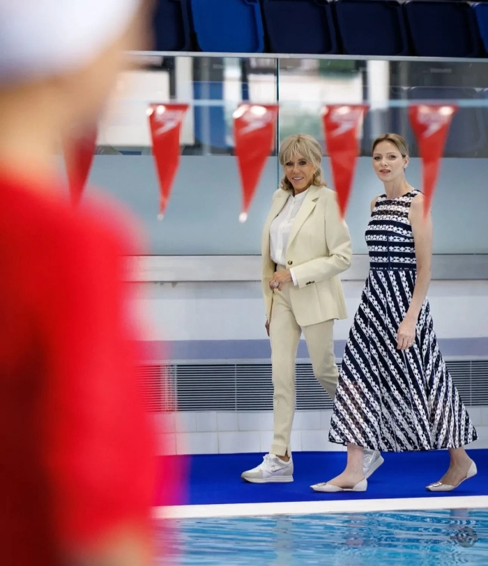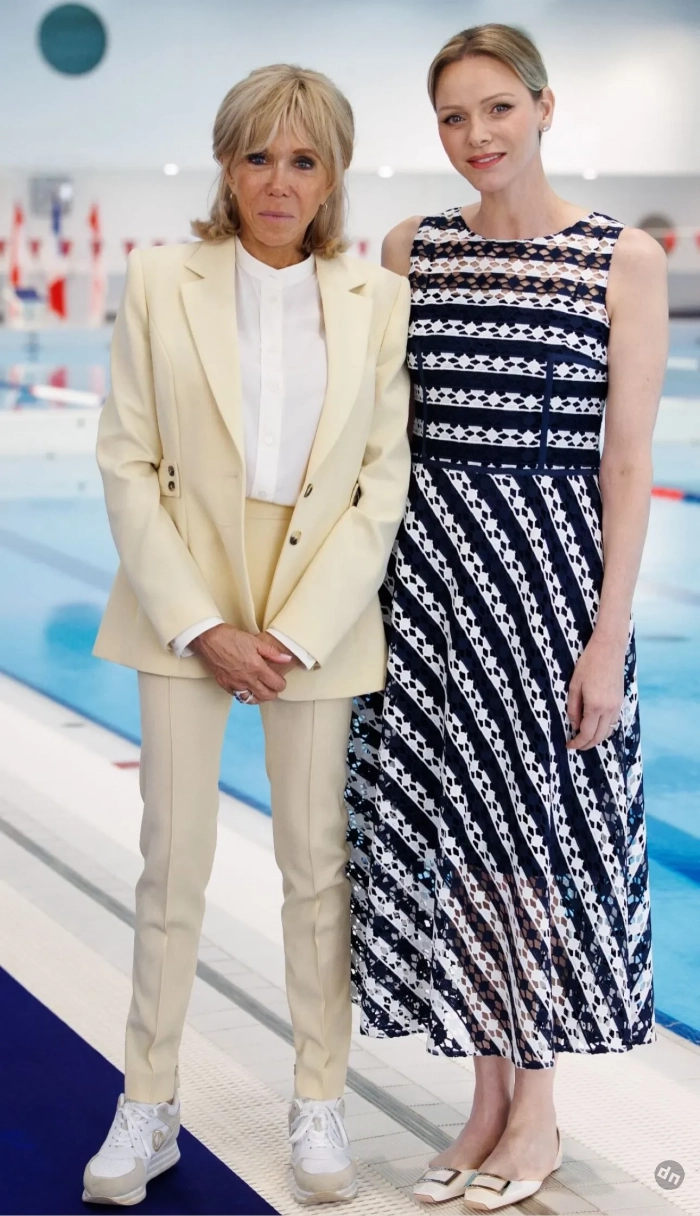 Для визита 47-летняя супруга князя Монако Альбера II выбрала платье в чёрно-белую полоску, а 72-летняя Брижит надела светлый брючный костюм и кроссовки.