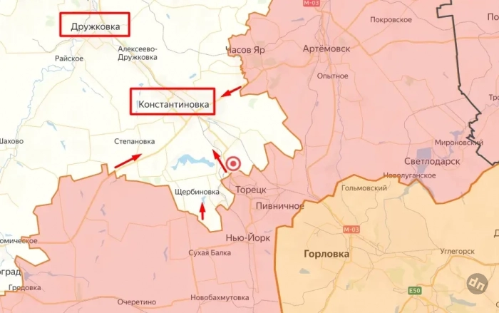 Одновременно с этим наступление ведется и с других направлений: с юго-запада по трассе Н20 со стороны Новооленовки, с юга от Романовки и с юго-востока по трассе Т0516 со стороны Дзержинска (бывшего Торецка).