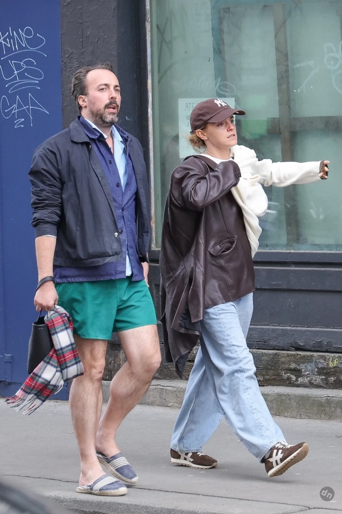 Для выхода на публику 35-летняя актриса выбрала коричневую кожаную куртку, надетую поверх белого лонгслива, и свободные джинсы. Её образ дополнили кепка и кеды в тон верхней одежде. Спутник Эммы предстал в неоднозначном наряде: несколько надетых друг на друга рубашек, сверху ветровка, короткие бирюзовые шорты и обувь, напоминающая домашние тапочки.