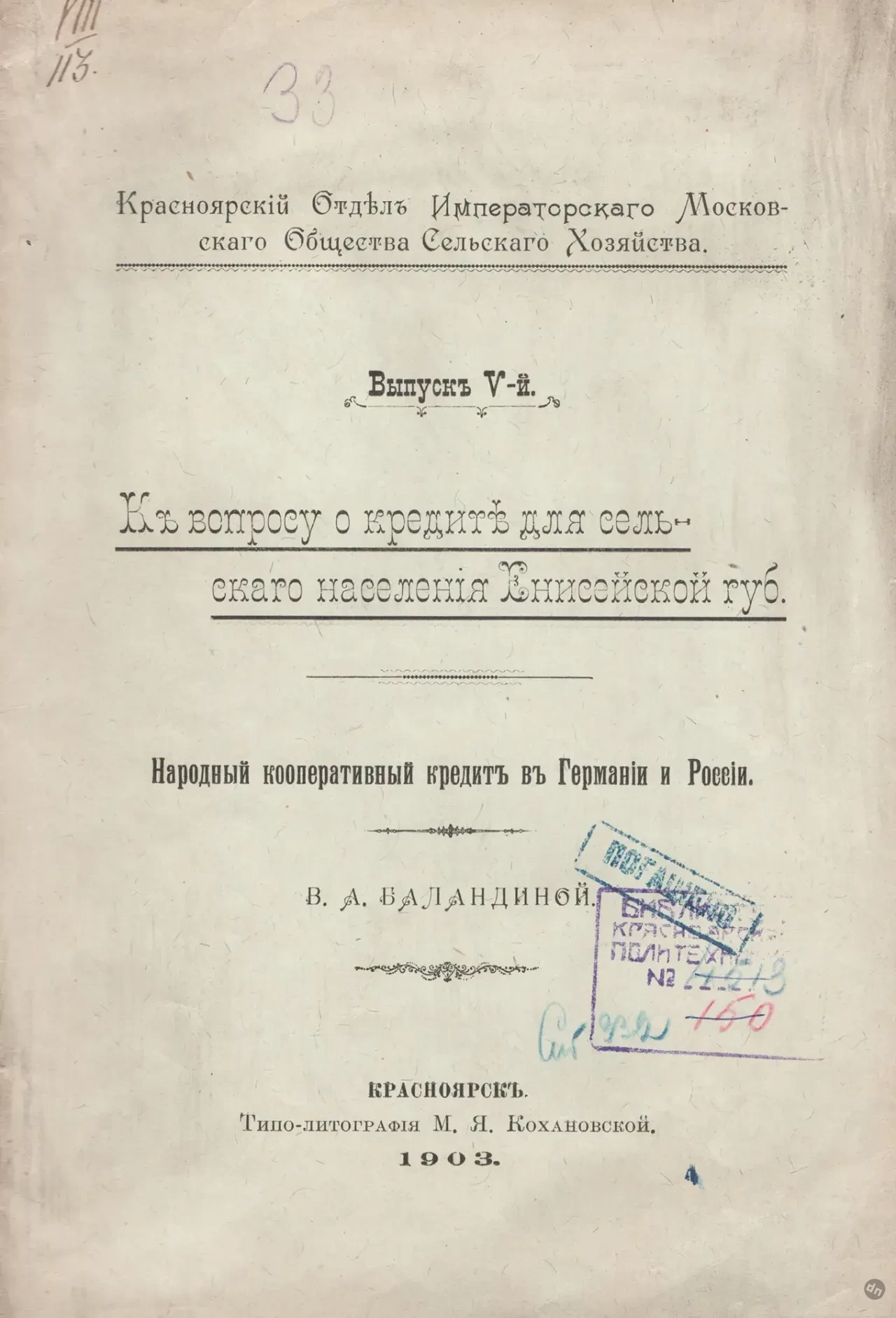 Брошюра. Баландина В.А. К вопросу о кредите для сельского населения Енисейской губернии. КККМ ОФ 10074/228