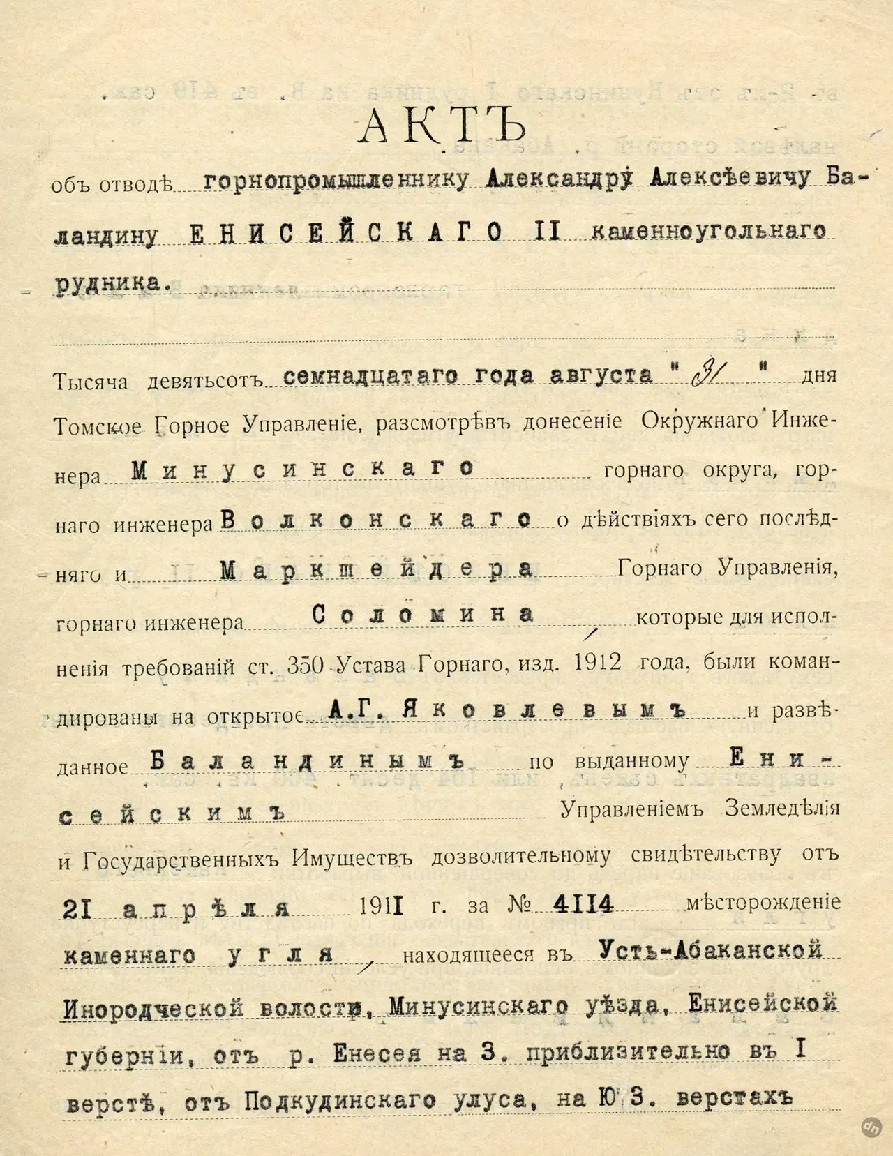 Акт об отводе Енисейского каменноугольного рудника, находящегося в Усть-Абаканской инородческой волости. КККМ ОФ 12376/5