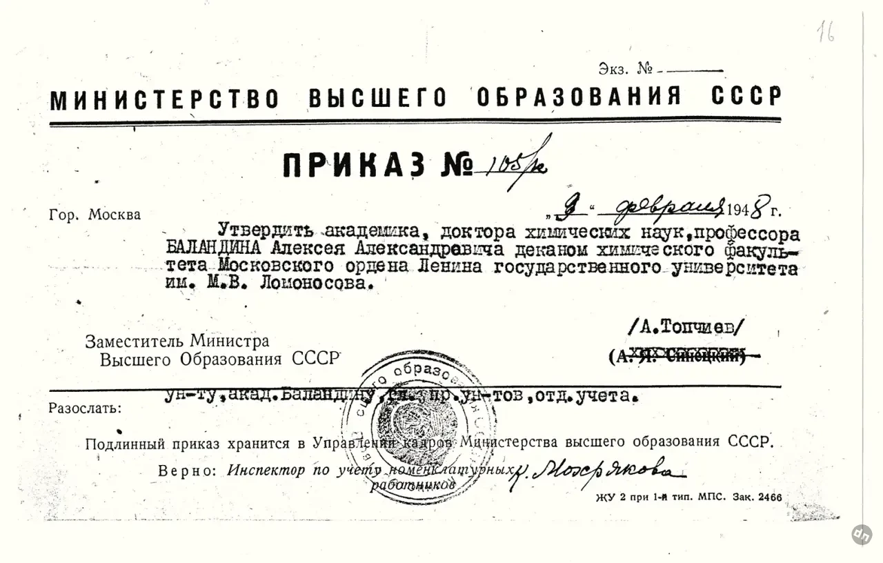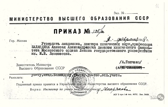Академика Баландина освободили и реабилитировали в 1953 г. благодаря ходатайству его учителя Н.Д. Зелинского.