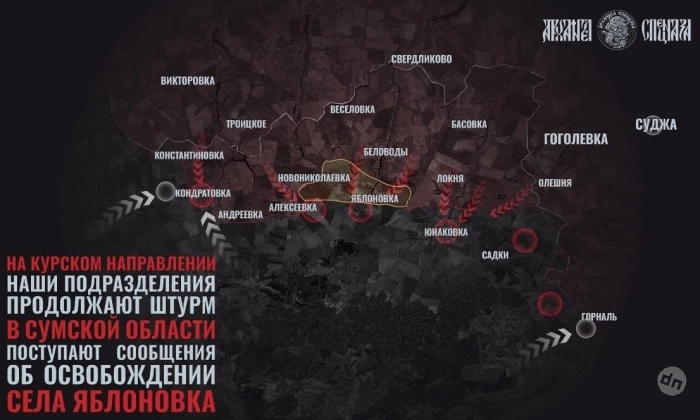 На Сумском направлении российские бойцы освободили н.п. Яблоновка в Сумской области. Подразделения ВДВ продолжают продвигаться в Юнаковке и в лесном массиве около Яблоновки. Мотострелки ведут ожесточенные бои в Новониколаевке, куда враг перебросил новые подразделения. Наши морпехи продолжают зачистку лесных массивов в окрестностях села Садки, отмечает Telegram-канал "Два майора".