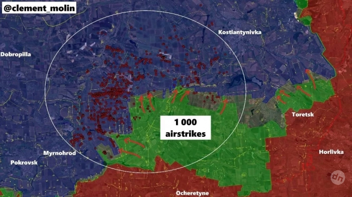 На Покровском направлении происходит ряд важных событий. В частности, на западном охвате Покровска наши теснят противника восточнее Песчаного, на восточном - зачищают елизаветовский «карман». С ожесточёнными боями Вооружённые силы Российской Федерации осуществляют штурмовые действия в следующих населённых пунктах: Миролюбовка, Мирное и Малиновка. Взято Коптево. Также на Покровском направлении, согласно спутниковым данным, за три недели по линии обороны между Покровском и Константиновкой ВС РФ нанесли около 950 авиаударов по линии обороны противника (карта 5). Наиболее интенсивные удары зафиксированы на Покровском направлении, на Дружковском и Константиновском чуть меньше.