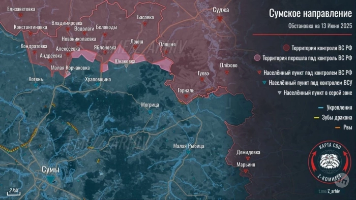 «Сама по себе Сумская область является весьма небольшой, самая большая, к слову, Днепропетровская. Но тем не менее наши успешные действия там говорят о том, что у противника нет возможностей, средств сдерживать наши действия и остановить продвижение на Сумы, несмотря на то что там были проведены серьезные фортификационные мероприятия. Например, очень хорошо было проведено минирование. Но даже несмотря на это, я вижу, что Сумы для противника будут обречены, они станут нашими. И да, это выход на Харьков»,