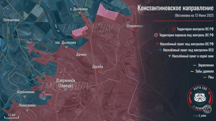 Западнее Торецка наши продвигаются по лесам южнее Яблоновки, а также пытаются продавить оборону южнее Александро-Калиново. В ближайшее время можно ожидать штурм этого мощного укрепрайона. На востоке от Торецка, в районе Дылеевки, ВС РФ провели разведку боем и выбили противника из опорного пункта. Ж/д станция в Дылеевке под российским контролем, а в самом селе ещё идут бои, сообщает Олег Царёв в своём Telegram-канале.