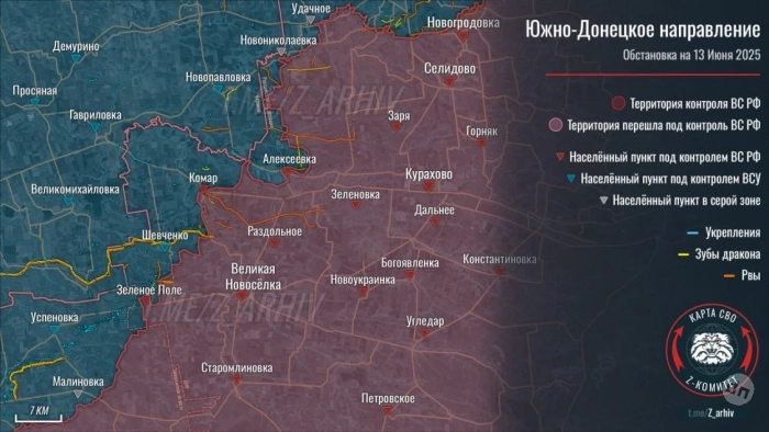 На Угледарском направлении Вооружённые силы Российской Федерации (ВС РФ), опираясь на Зелёное Поле, атакуют по направлению к Запорожскому и Темировке, сковывая резервы ВСУ в районе Комара, а также создают условия для ещё одного прорыва в Днепропетровскую обл. Восточнее Комара наши выбили врага из Запорожья и подошли к окраинам Ялты. Двигаясь дальше, наши выйдут в районе посёлка Толстой и перекроют «северное» снабжение группировки ВСУ в Поддубном и Мирном, к которым наши подходят с юга, от Комара. Севернее по фронту Минобороны подтвердило освобождение Зелёного Кута - села в 4 км к западу от освобождённого Богатыря и в 3 км к востоку от границы с Днепропетровской обл. При этом украинские части в районе Орехово-Новоукраинка-Андреевка вполне могут остаться в оперативном окружении.
