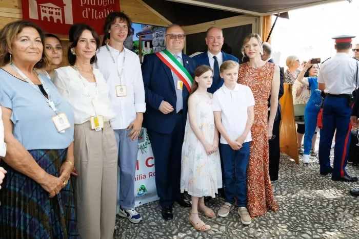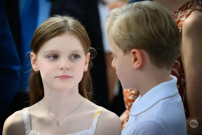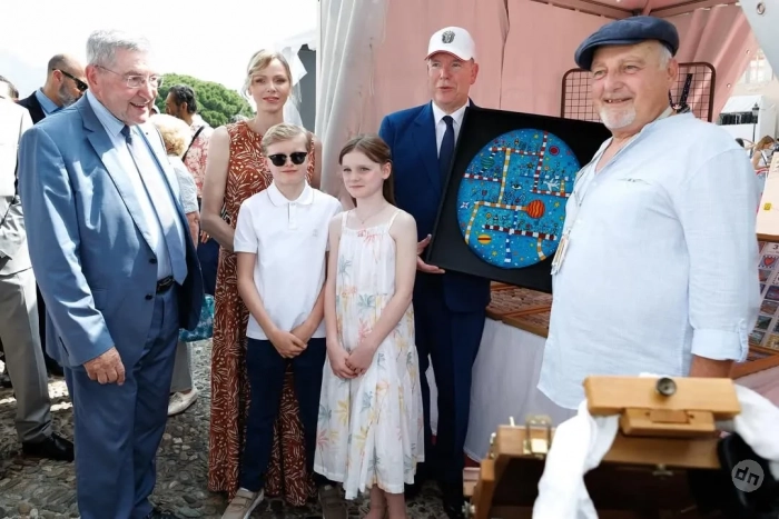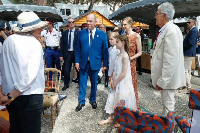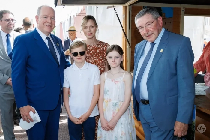 47-летняя княгиня появилась на публике в длинном коричневом платье с узором, а 67-летний князь надел синий костюм с галстуком. 10-летний сын супругов, наследный принц Жак, позировал фотографам в белом поло, джинсах и солнцезащитных очках, а его сестра-близнец, принцесса Габриэлла, в белом сарафане.