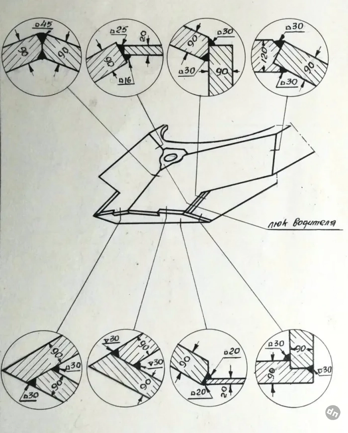 7. Для соединений нижних лобовых деталей с днищем корпуса хорошие результаты показывают такие же соединения, как и на крыше с лобовыми подкрылками, но выполненные с применением сварки только качественными электродами.