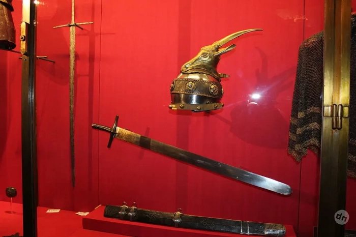 Шлем и меч Скандербега, музей искусств, Вена. Обратите внимание, что шлем украшает голова горной козы, молоком которой он питался, будучи блокирован на вершине бесплодной горы