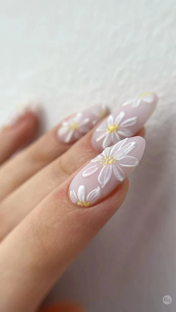 Простые, будто нарисованные от руки ромашки и маки — последний штрих в летней палитре. Без симметрии и совершенства, зато с очарованием. Особенно круто смотрятся на коротких ногтях и светлом фоне.