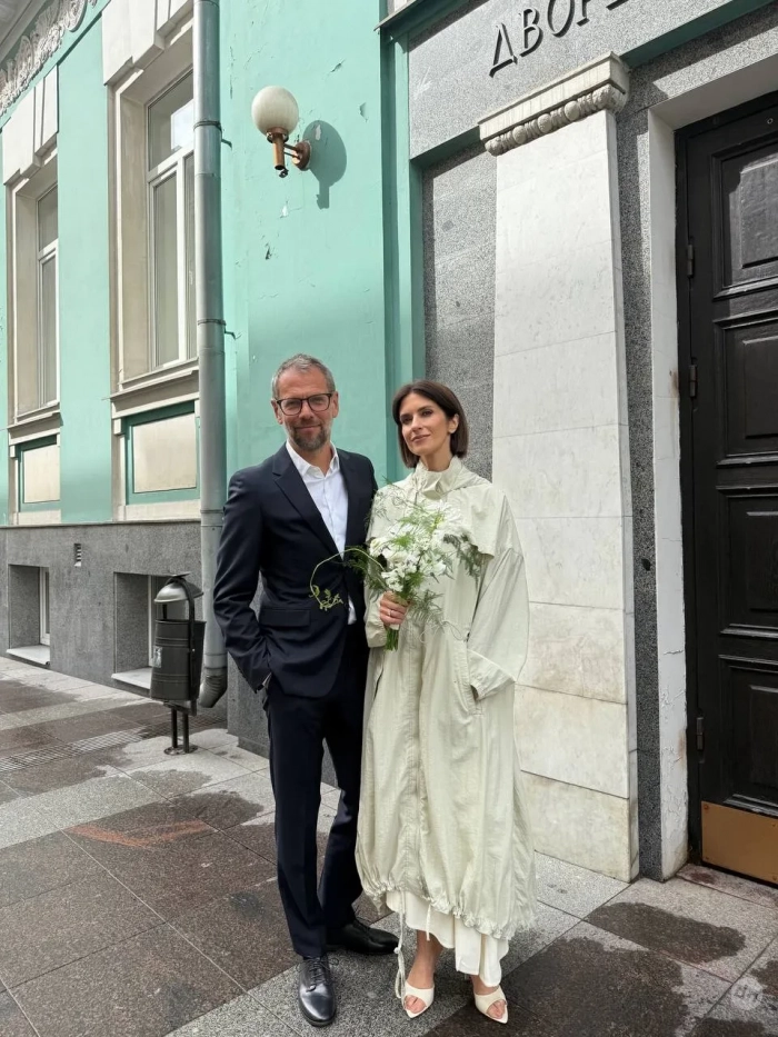 Торжество состоялось в Грибоедовском ЗАГСе в Москве. Для церемонии Ксения выбрала платье Prada и плащ Sanchy в тон, дополнив образ минималистичным букетом невесты. Жених был в классическом чёрном костюме. Праздник прошёл в кругу близких — с парой были их дети от предыдущих отношений.