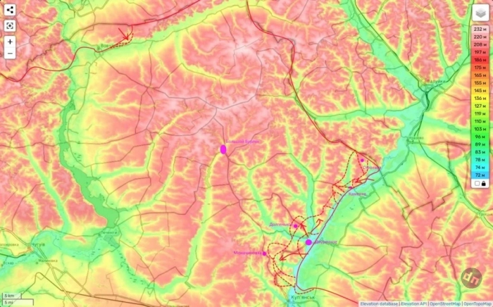 Российские подразделения медленно, но уверенно продвигаются к холмистым лесам в районе Малой Корчаковки. Для обеспечения собственной логистики ВС РФ стремятся взять под контроль «треугольник» Могрица - Большая Рыбица - Мирополье.