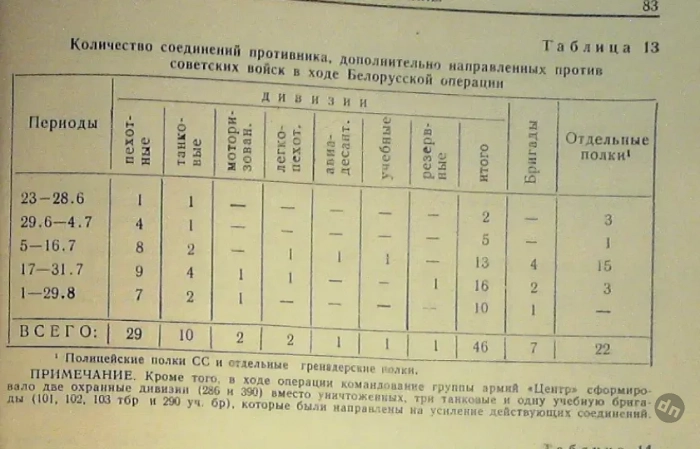 Эта таблица является наглядным примером того, как должен выглядеть полный учёт немецких сил. Подобных данных по немецким силам в полосе операции «Багратион» нет. Но такие сведения необходимы для полного учёта немецких сил в операции.