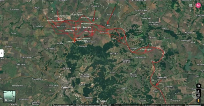 По его словам, активные бои уже развернулись в холмистой местности у Малой Корчаковки. Российские войска медленно, но уверенно продвигаются, стремясь взять под контроль условный «треугольник» Могрица - Большая Рыбица - Мирополье.