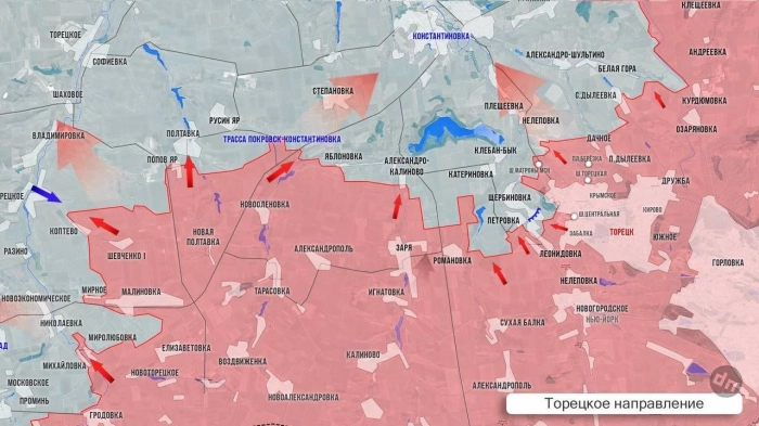 К западу от Торецка ВС РФ постепенно продавливают оборону ВСУ в Яблоновке. От Александро-Калиново наши зачищают территории, расширяя зону контроля. Севернее Торецка бои продолжаются в районе Белой Горы и у Нелеповки.