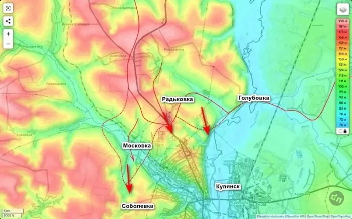 Вообще же, за последние сутки наши продвинулись в районах Малой Шапковки, Кондрашовки, Радьковки, Голубовки и Петропавловки Харьковской области. Подтверждают это и другие российские ресурсы. Также продолжается охват Купянска с западного направления, где после взятия Московки (Мирное — укр.) российские войска продвигаются на Соболевку. Фактически на сегодняшний день Купянск находится в полукольце, которое может превратиться в полноценный котел.
