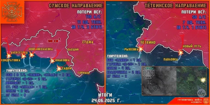 На Тёткинском и Глушковском направлениях в Курской области Вооружённые силы Украины (ВСУ) не оставляют попыток прорыва на нашу территорию, восполняя потери в штурмовых группах за счет операторов БпЛА. Северяне отражают атаки врага, уничтожая оккупантов в районе госграницы и в пунктах временной дислокации в глубине Сумской области.