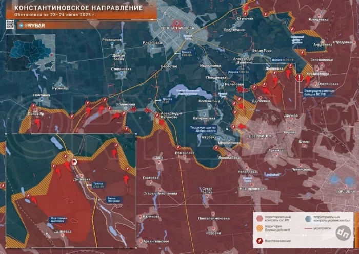 На Торецком направлении западнее Торецка вязкие встречные бои в Яблоновке, в районе Александрово-Калиново наши части зачищают прилегающие территории. МО РФ сообщило об освобождении с. Дылеевка к северу от Торецка. Сейчас ВС РФ предстоит освободить Белую Гору и Александро-Шультино - это последние сёла перед Константиновкой. В районе Нелеповки продолжаются тяжёлые бои, основная цель которых - выйти к берегу Клебан-Быкского водохранилища и полностью обрубить логистику ВСУ в сторону Щербиновки и Петровки.