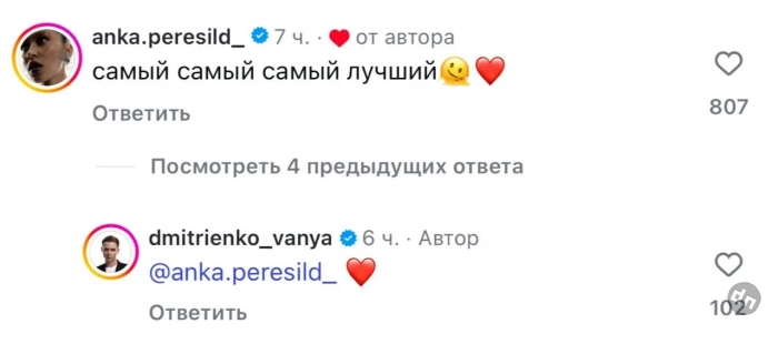 В сети обратили внимание, что недавно Анна Пересильд вновь подогрела разговоры о своих отношениях с Дмитриенко. Она появилась в комментариях под его постом в инстаграме*, где он представил новый трек. "Самый-самый-самый лучший", — написала Анна, добавив эмодзи в виде сердца (Ваня в ответ оставил такое же эмодзи).