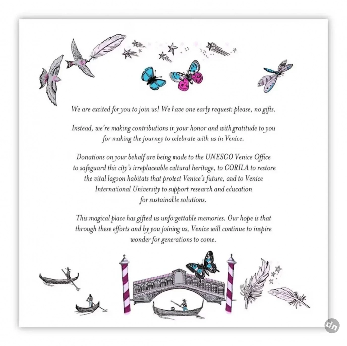 Лорен Санчес и Джефф БезосПомимо мер безопасности в сети обсуждают и приглашение на свадьбу Джеффа и Лорен, которое уже высмеяли пользователи. Оно напечатано курсивом на белом фоне и украшено бабочками, звёздами и гондолами. Ксения Собчак отметила, что пригласительное похоже на "открытку в духе рассылок от родственников на праздники в What’sApp". В соцсетях также пишут, что более пригласительное безвкусное и от одного из самых богатых людей мира можно было бы ожидать чего-то более элегантного.