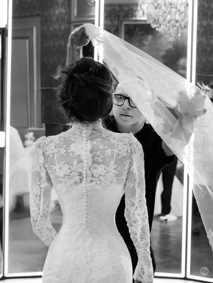 В кадр попали и модельеры Доменико Дольче и Стефано Габбана, которые создавали её свадебное платье: на одном из снимков Доменико Дольче помогает 55-летней невесте закрепить фату.
