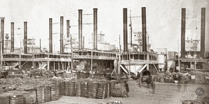 Причал, полный пароходов, стоящих под погрузкой. По крайней мере два из них, те, что видны нам справа, — двухколесные. Фотография XIX в.