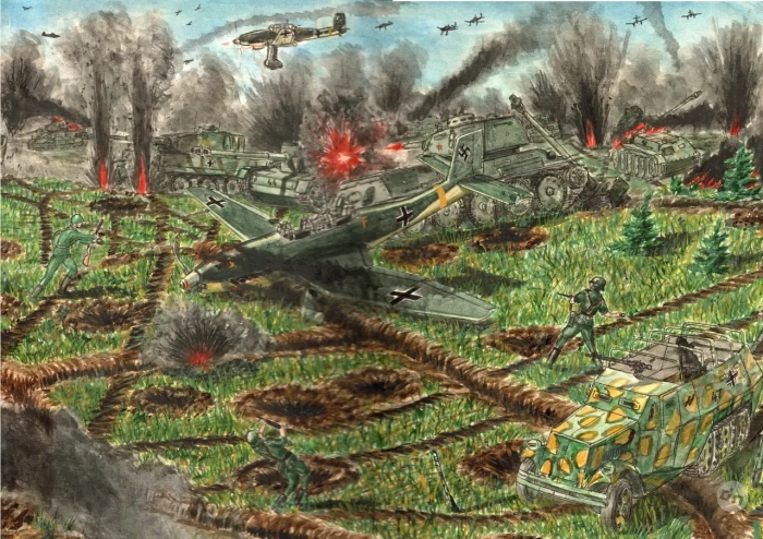 Другим важным занятием стало изготовление и запуск «ракет». Это стало возможно благодаря тому, что в городе шли жестокие бои. Во дворе нашего дома, наверное, стояла телега или машина с ящиками с винтовочными патронами и другими боеприпасами. Скорее всего, атакованная Ил-2. Ежегодно, вскапывая огород, я находил до 10 винтовочных патронов калибра 7,92 мм. Кроме того, нашел две гильзы от авиационной пушки калибра 23 мм. Из патронов плоскогубцами извлекали пули, чёрный порох насыпали на алюминиевую фольгу от конфет. Один конец закручивали плотно, а другой чуть открытым. Клали на наклонную доску и поджигали. Летали такие ракеты довольно высоко. Запускали осенью на картофельном поле, за домами, чтоб не спалить сараи. Посреди поля стоял дуб, на нем у нас был штаб. Когда ездил в пионерский лагерь в школе на станции Опухлики, местные ребята показали место в железнодорожной насыпи, где во время войны разбомбили эшелон с артиллерийскими снарядами. В насыпи можно было накопать артиллерийские пороха. Из них ракеты получались ещё лучше.