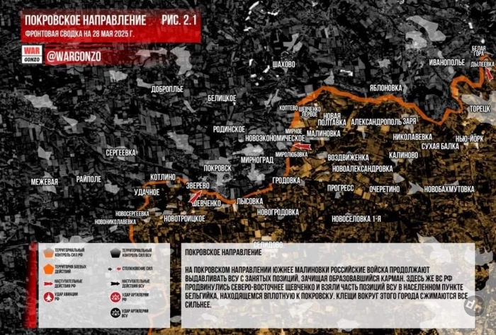 На Покровском направлении южнее Малиновки российские войска продолжают выдавливать ВСУ с занятых позиций, зачищая образовавшийся карман. Здесь же ВС РФ продвинулись северо-восточнее Шевченко и взяли часть позиций ВСУ в населенном пункте Бельгийка, находящемся вплотную к Покровску. Клещи вокруг этого города сжимаются все сильнее.