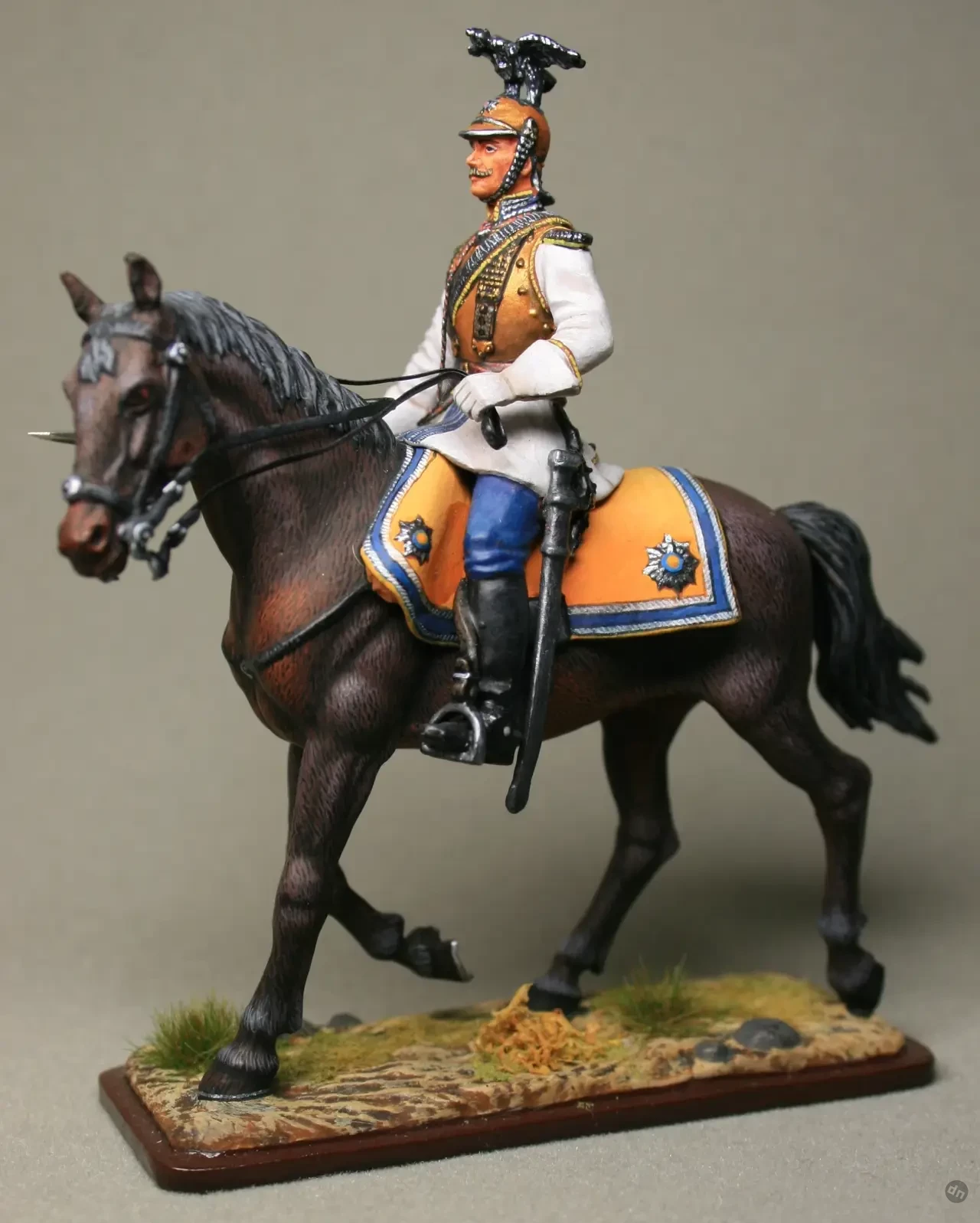 Фигурка обер-офицера в белом колете с серебряным галуном Лейб-гвардии Кирасирского Его Величества полка (так называемые «Жёлтые» или Царскосельские кирасиры). Воротник и выпушка на клапанах карманов и обшлагах желтого приборного сукна. Перчатки с крагами надевали только при полной парадной и походной форме в строю. Кираса и каска золоченные, фигурка орла и Андреевская звезда на каске – серебряные. Попона желтого цвета с голубой каймой. Производитель: «ЭЙДЖЕС. Санкт-петербургская историческая коллекция»