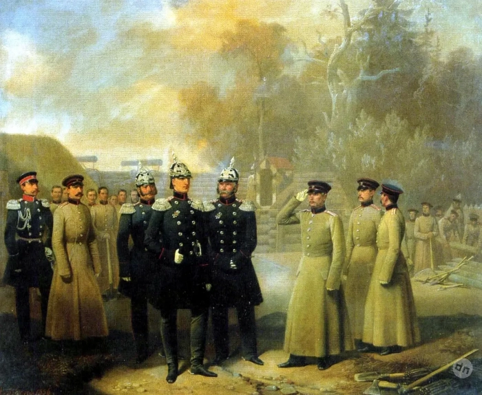 «Великий князь Николай Николаевич Старший осматривает работы гвардейских саперов в устье Невы». Справа – начальник инженеров Гвардейских корпусов генерал-лейтенант П. А. Витовтов, слева – командир лейб-гвардии Саперной бригады генерал-майор Н. Ф. Хомутов 2-й. Командир роты рапортует о ходе выполнения поставленной задачи. Время создания картины: 1856 г. Художник Гебенс А. И. (1819–1888). Военно-исторический музей артиллерии, инженерных войск и войск связи, Санкт-Петербург
