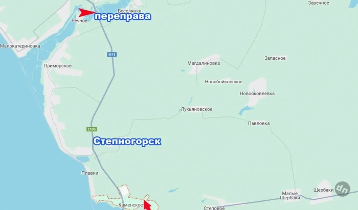 Для справки: от Каменского до Степногорска – 3-4 км. И снабжение гарнизона ВСУ в Степногорске может быть перерезано, если будет уничтожена переправа (помечена на карте) к северу от него – через реку Конка, в районе Панского озера – близ места впадения в Днепр.